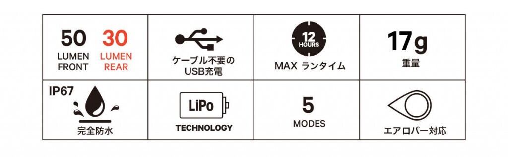 ■ 最大ルーメン: FRONT 50ルーメン / REAR 30ルーメン